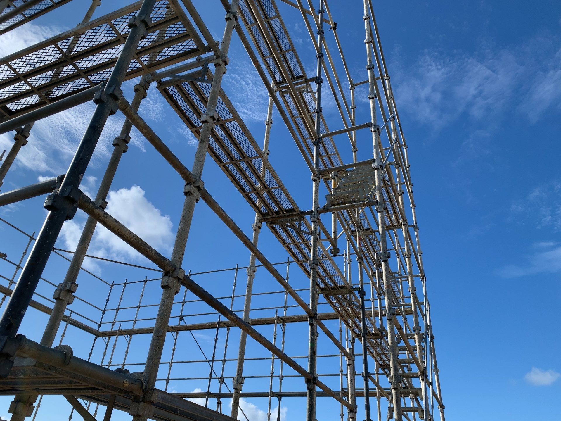 仮設足場工事とは、建物の建築や解体、改修などの作業を安全かつ効率よく行うために、一時的に設置する足場を組み立てる工事です。